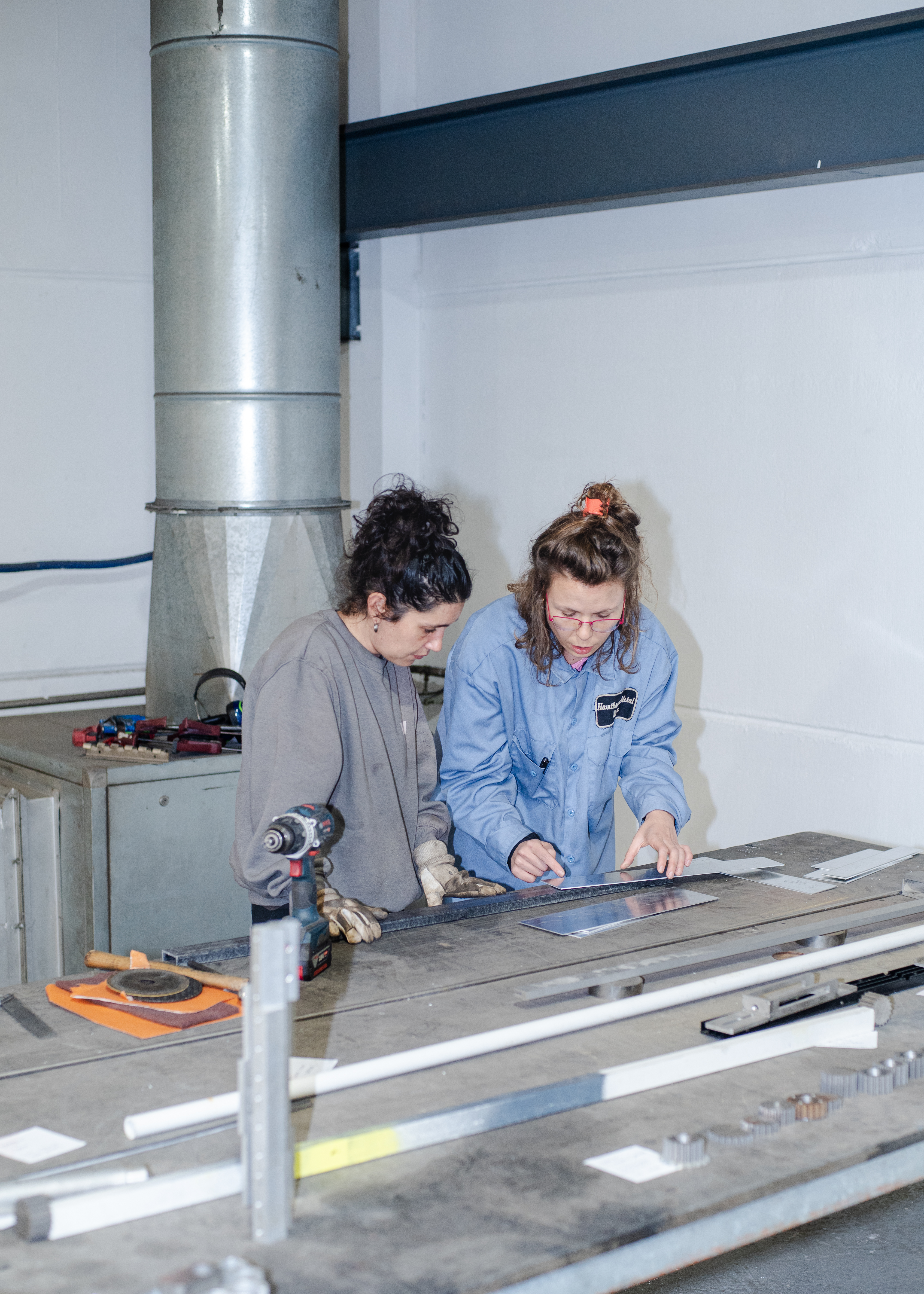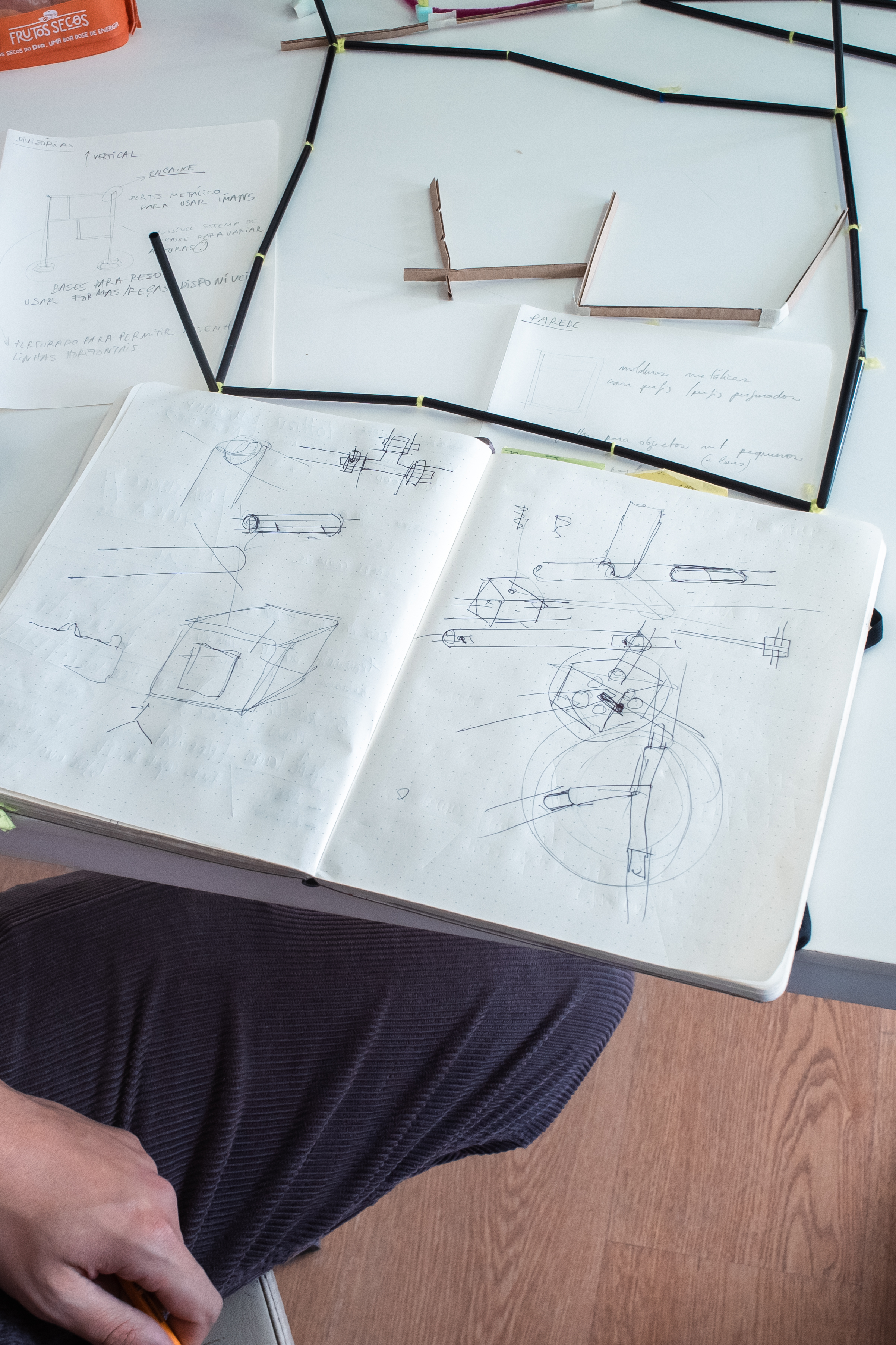 No início de maio de 2024, a artista e investigadora Catarina Real deu início à sua residência artística No Entulho com a intenção de desenvolver e produzir alguns dispositivos de exposição. A partir de peças e acessórios sobrantes do fabrico de caixilhos e da produção da ArtWorks, a Catarina recolheu dos contentores da fábrica perfis metálicos, pré-aros, distanciadores, tubos de alumínio, entre muitas outras peças, e readaptou-os, fazendo diversas estruturas e composições.