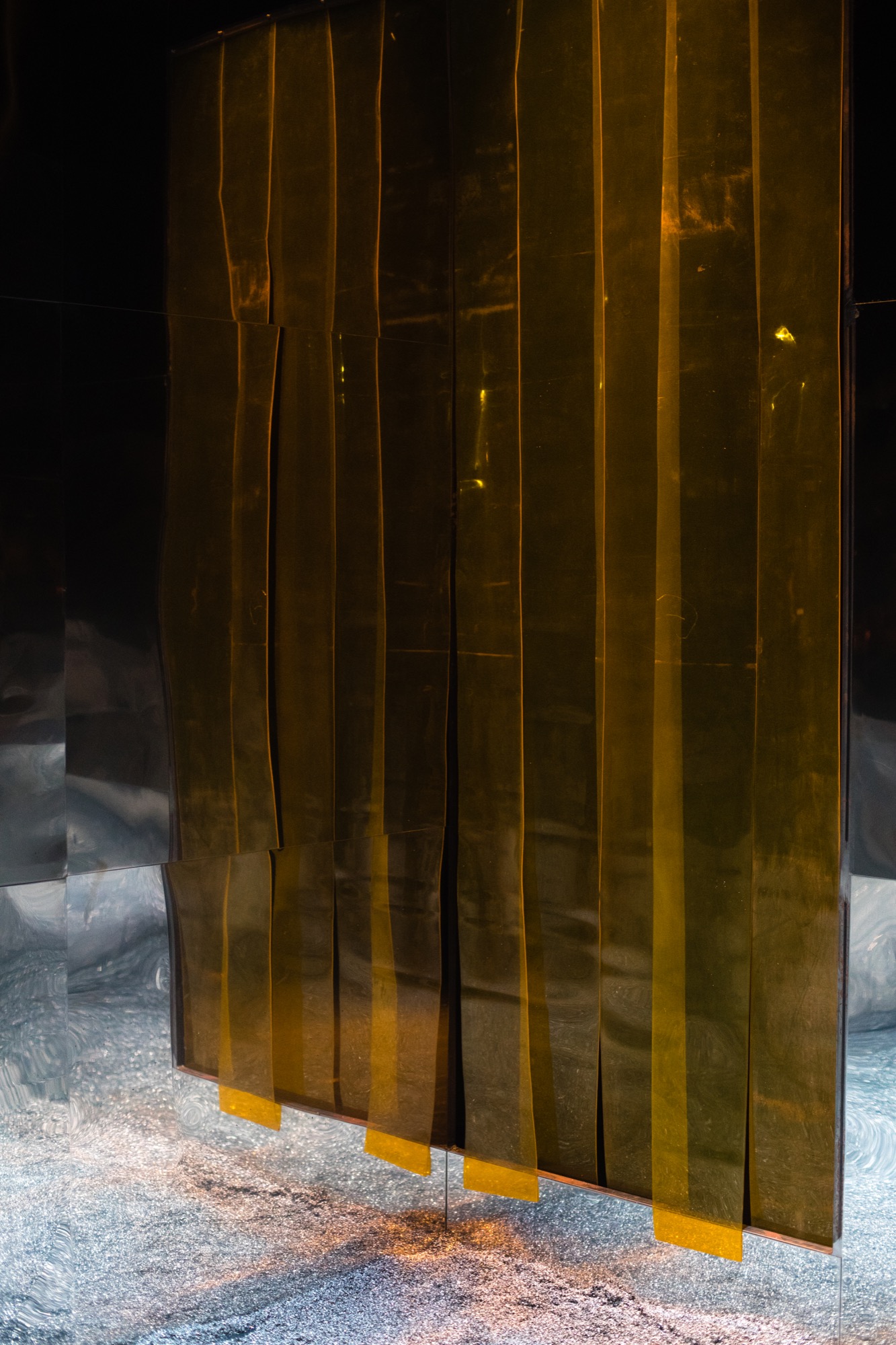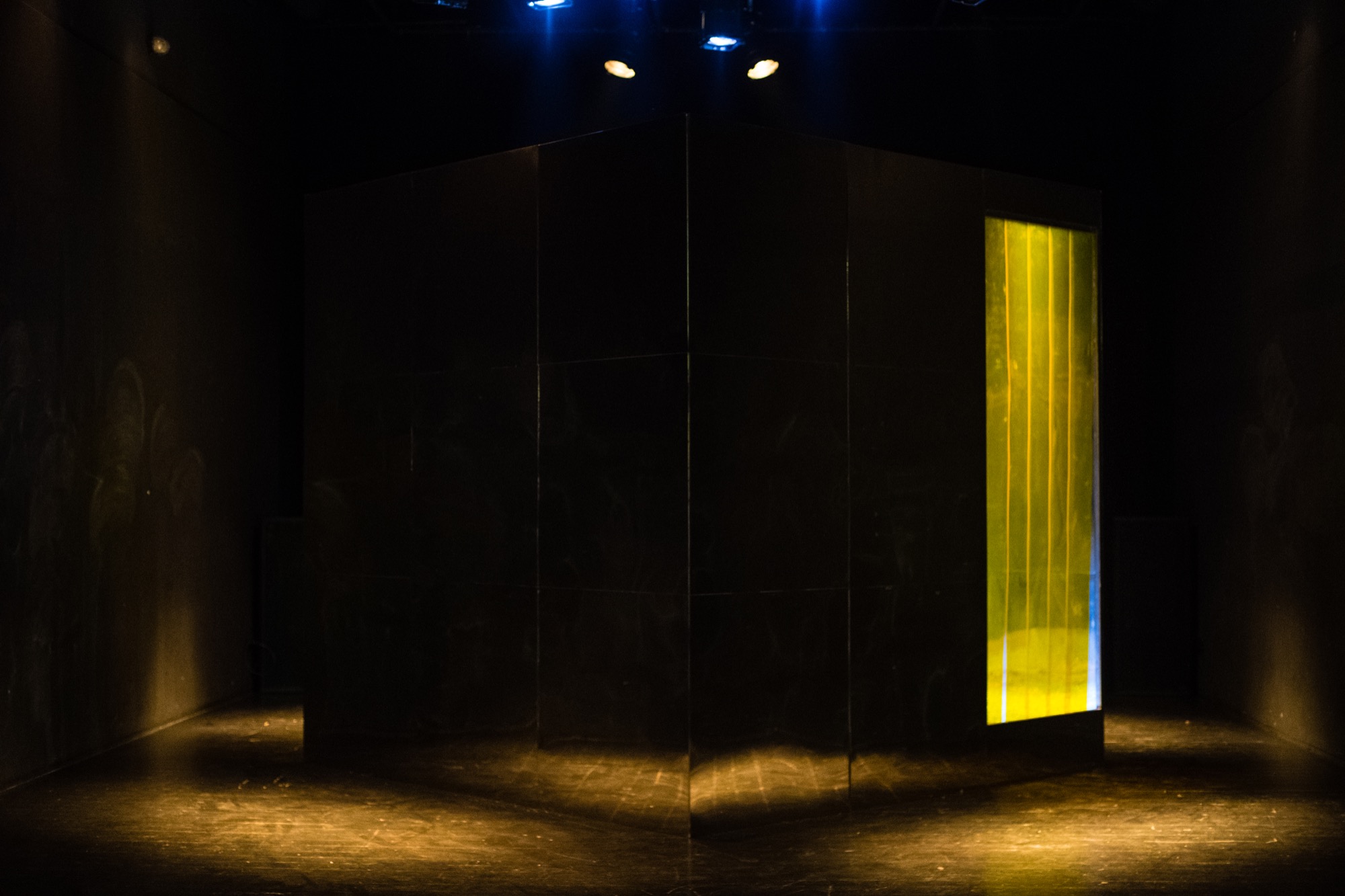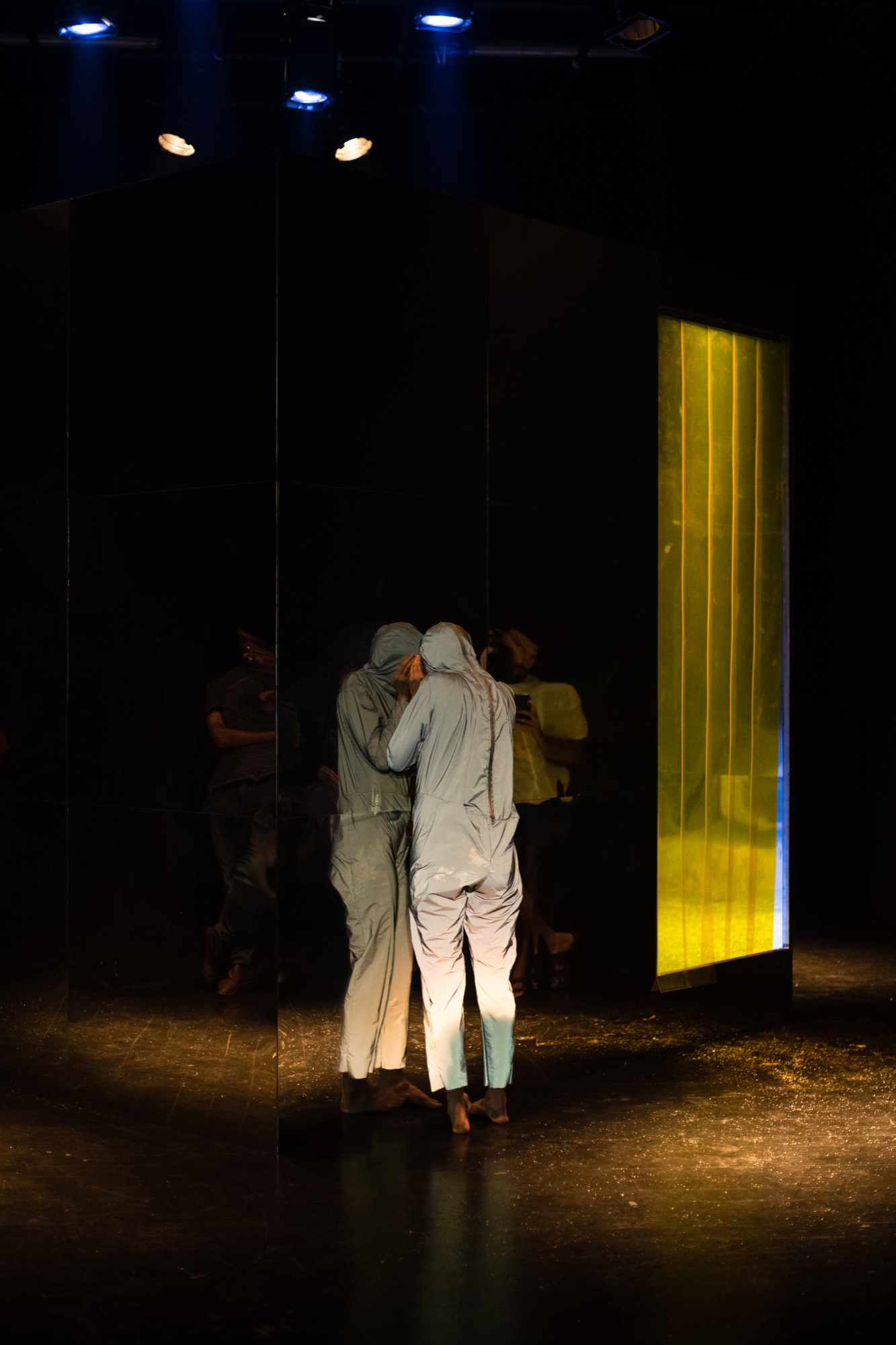 Neste Disfarce, disfarce., regressam aos dispositivos de interação com o público (como em Popper Non Popper de 2015, ou como em Horto de 2017, estreado na mala voadora), considerando desta vez a circunstância de estarem a produzir para uma exposição ou, mais genericamente, pensando a partir da ideia de “museu”. Propõem um trabalho com dois componentes. (1) Ao entrar num cubo cujo interior é espelhado, o público depara-se com a sua própria imagem. Trata-se de uma obra que se inscreve na tradição minimalista de interação entre obra e contexto, ou entre obra e observador, e ecoa obras da década de 1960 como os cubos espelhados de Robert Morris ou os efeitos perceptivos das salas de Dan Graham. Uma cenografia para o protagonismo de quem vê, que se vê face ao constrangimento de se ver a si próprio, e também face ao constrangimento físico causado pelo pavimento sobre o qual tem de deslocar-se. (2) Numa intervenção de natureza performativa, o público da exposição também é colocado perante o seu próprio reflexo, não em sentido literal, mas através do confronto com o comportamento de outros elementos do público, no qual ele poderá rever-se. Um espelho social.